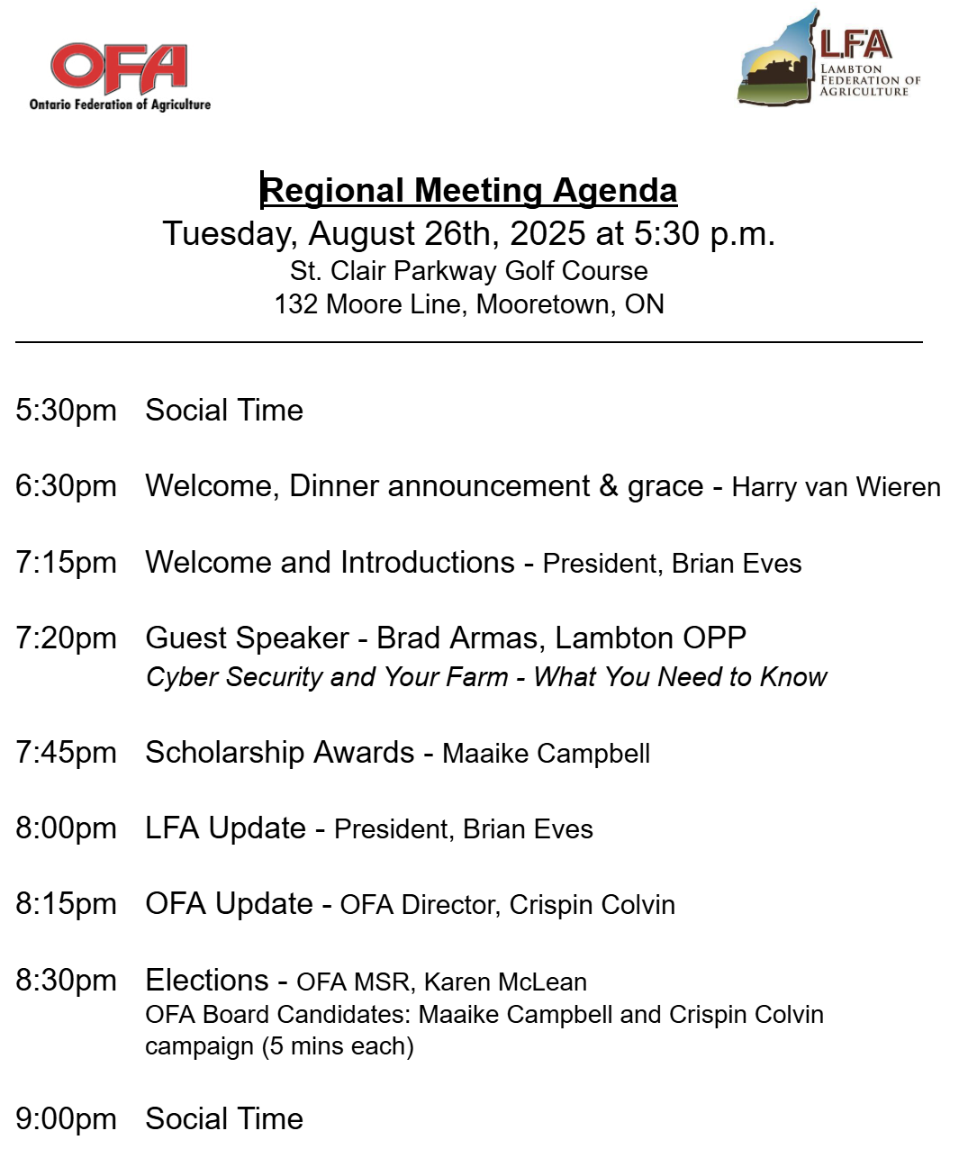 Provided key items that LFA is keeping an eye on in Lambton County. Participate in farm shows, 4H chili cook off, All Candidates Meeting, Career night at PE McGibbons, Lambton Soil & Crop, Lambton County Council Delegation. Municipal Bus Tour.